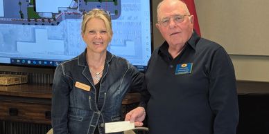 Ernie Hobbs of Wenatchee Downtown Kiwanis Club gives donation of $500 to Dorry Foster, Executive Director of the Wenatchee YMCA. Dorry spoke at a recent weekly meeting about progress of the new YMCA campus.